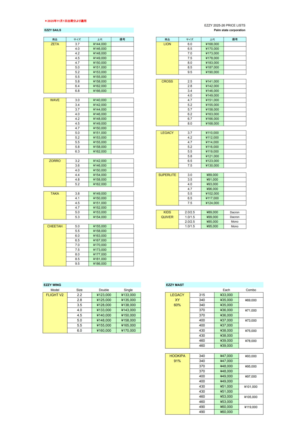 2026年 Ezzy Sail【価格表】 ◇画像をクリックしてご覧ください。 ◇現在の価格表になります。(税抜き) ◇2025/11/1 より PDFファイル 2026 EZZY SAILS 価格表 ▶2026 Ezzy Sail【価格表】 ■価格表・カタログ・在庫表 Tweet